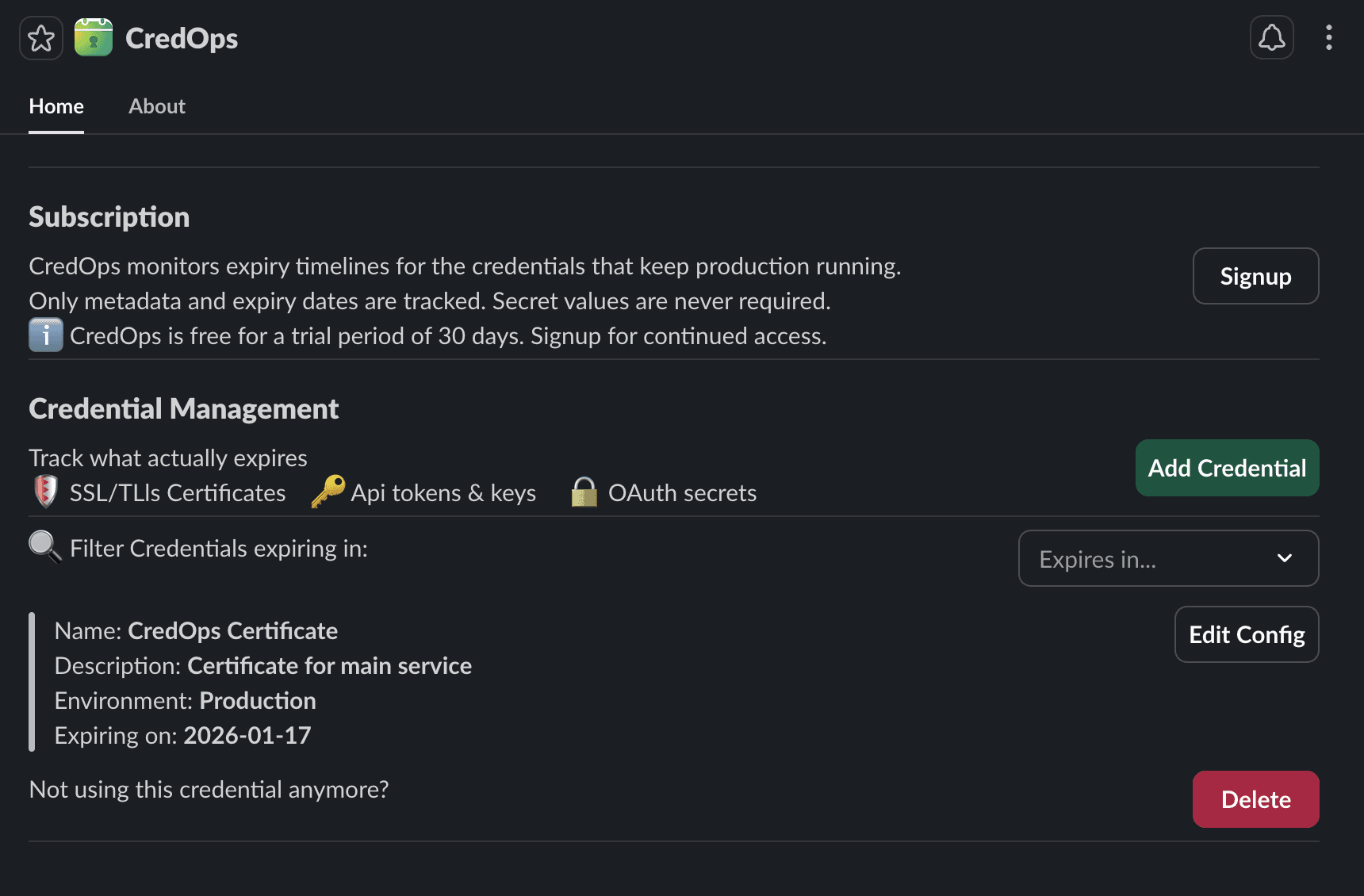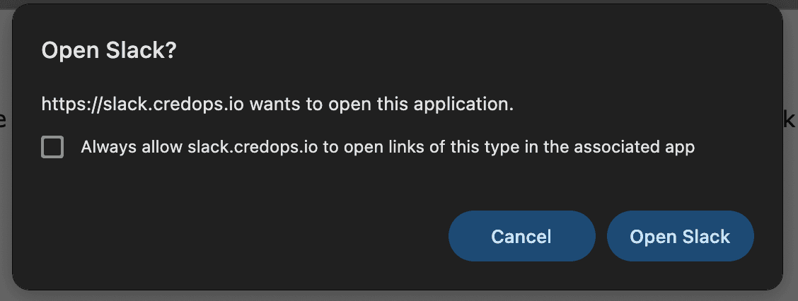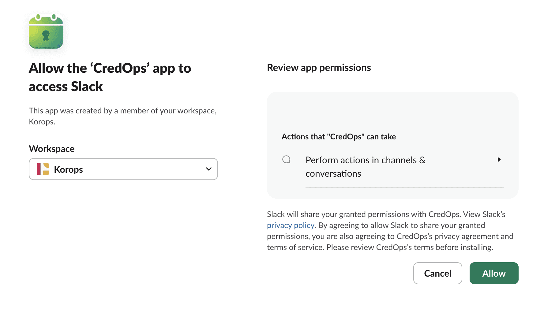 First install the app on slack by navigating to the link: http://slack.credops.io/slack/install